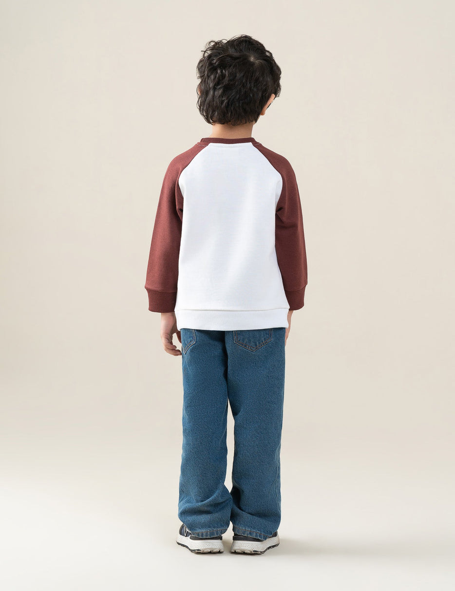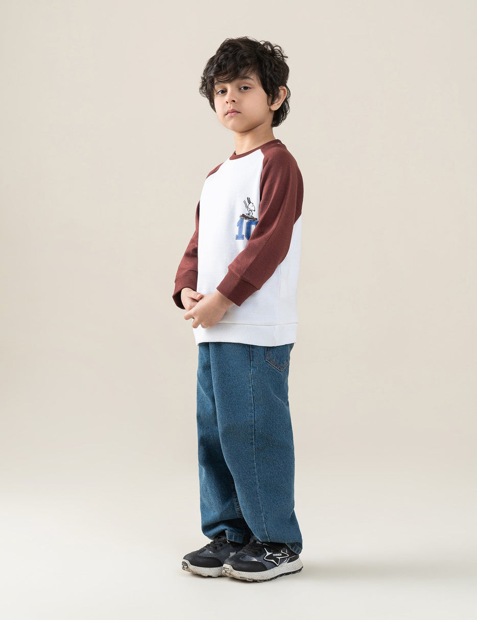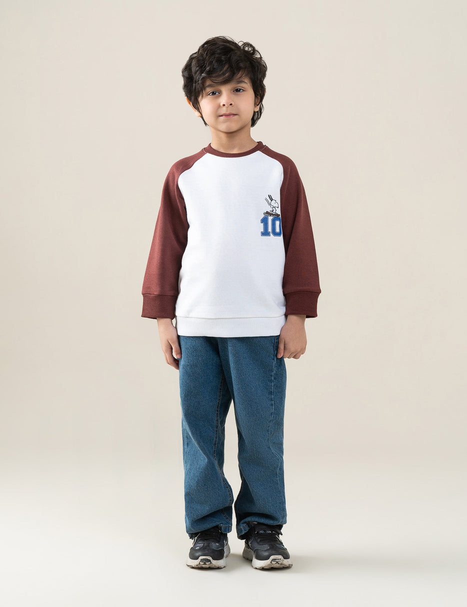 Keep his casual look fun and comfortable with this Snoopy Sweatshirt for little boys. Designed with a soft cream body and contrasting raglan sleeves, it features a cute Snoopy graphic with a sporty “10” print on the chest. Made from cozy, breathable fabric, this sweatshirt offers all-day comfort. Finished with a classic crew neck, long sleeves, and ribbed cuffs and hem, it’s perfect for everyday wear, school, or playtime. A stylish must-have for young Snoopy fans.
